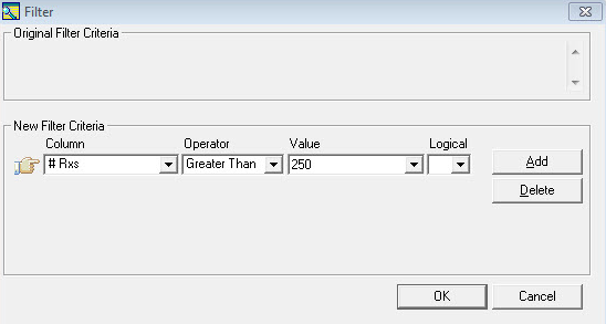 - Enter your filter criteria. For example, the image below shows the filter criteria that will only return doctors' that have prescribed over 250 prescriptions within the time period indicatedin the report criteria.
