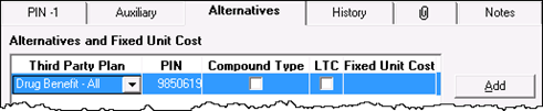 When a mixture has a PIN that falls under the MDL, then that PIN must be set in the Mixture’s Alternatives tab for adjudication (e.g. Methadone or an injectable mixture). Otherwise, if the mixture contains an ingredient that exists on the MDL, use the PIN 9857417 for a Generic Monitored Drug Compound. In all cases, the Third Party Plan must be Drug Benefit – All, as PharmaClik Rx will submit the ODB PIN to the NMS.