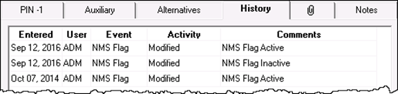 Changes to the NMS flag will be tracked in the History Tab of the Drug or Mixture Folder. The Comments column will indicate the state of the NMS flag: