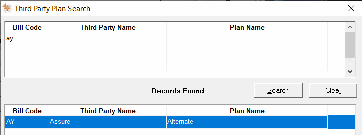 To see all the bill codes for a third party, search by the Third Party Name. For example, to see all the bill codes for Assure, enter "Assure" in the Third Party Name field.