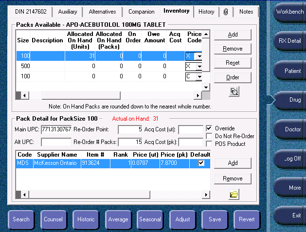 The Inventory tab in the Drug folder stores the monitored pack sizes for each drug. It provides the ability to add and delete pack sizes, adjust inventory levels for a product, and maintain multiple suppliers for specific pack sizes.